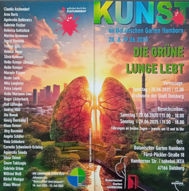 Dieses Jahr hat die Kunstausstellung im Botanischen Garten Hamborn das Motto "Die grüne Lunge lebt". Insgesamt stellen über 30 Kunstschaffende aus Duisburg und Umgebung am 28. und 29. Juni 2025 ihre Werke im Botanischen Garten Hamborn aus.