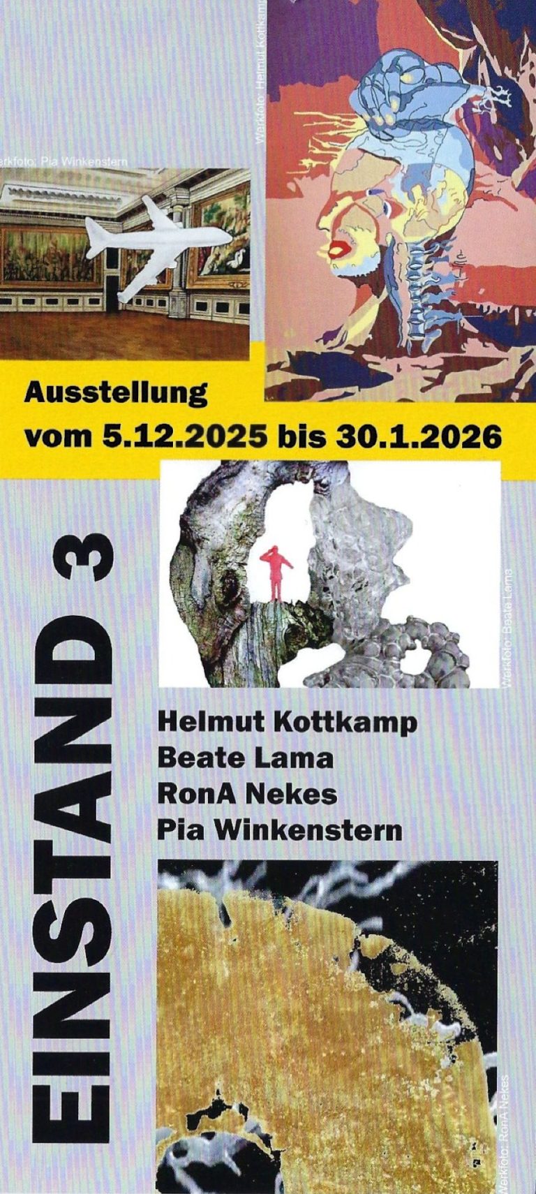 Die Arbeitsgemeinschaft Mülheimer Künstlerinnen und Künstler e.V. stellt in der Ausstellung Einstand ³ die neu aufgenommen Mitglieder Helmut Kottkamp, Beate Lama, RonA Nekes und Pia Winkenstern vor.